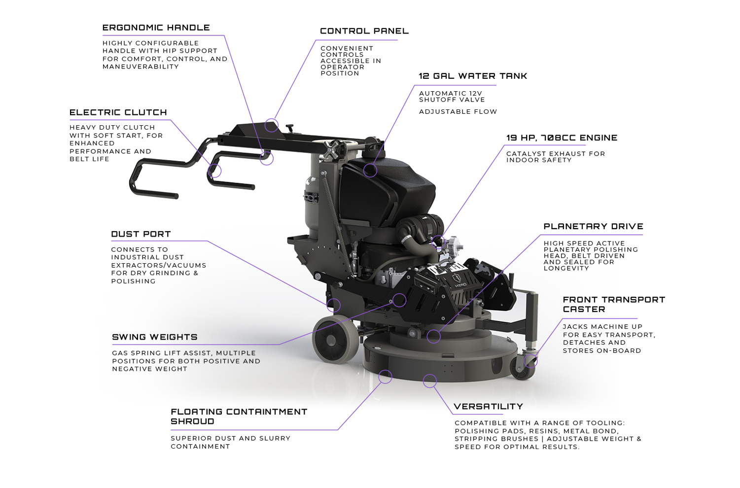 FAST – With 2X the tooling speed of traditional planetary machines and the cordless freedom of propane power, the HERO Z5 lets you complete jobs in less time. Faster passes increase productivity and lower labor costs — without sacrificing quality.