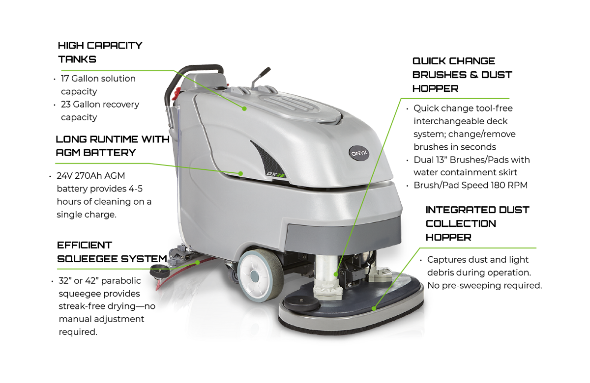 - 42" aluminum squeegee (32" option available), steel chassis, and rotationally molded tanks for lasting durability.