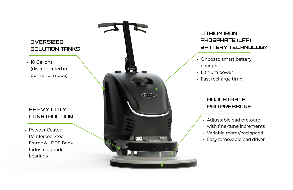 - Configuration Versatility – Variable speed range (600 - 1,800 RPM), onboard 10-gallon water tank for stripping/polishing use, wide range of pad/brush down-force adjustments.
