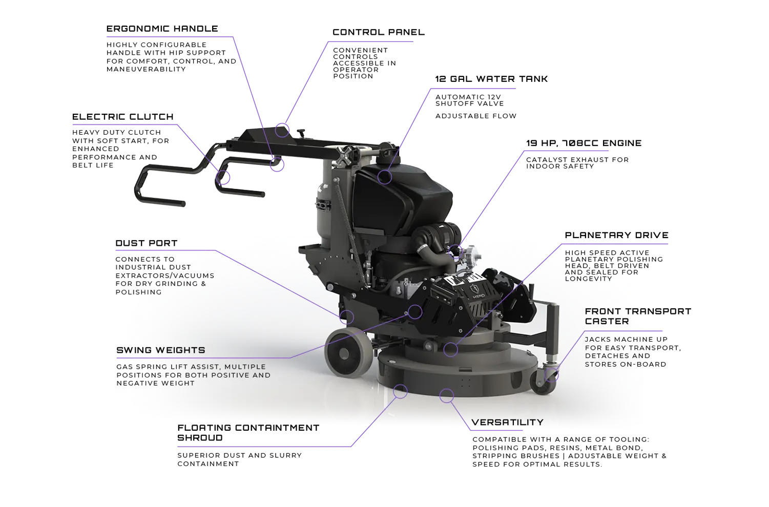 It shines as a polisher on concrete, terrazzo, and stone, operating at higher speeds than traditional grinders for faster maintenance, refurbishment, and repolishing. It’s also extremely effective as a stripper, using its powered planetary drive to cut through heavy layers of finish in a single pass.